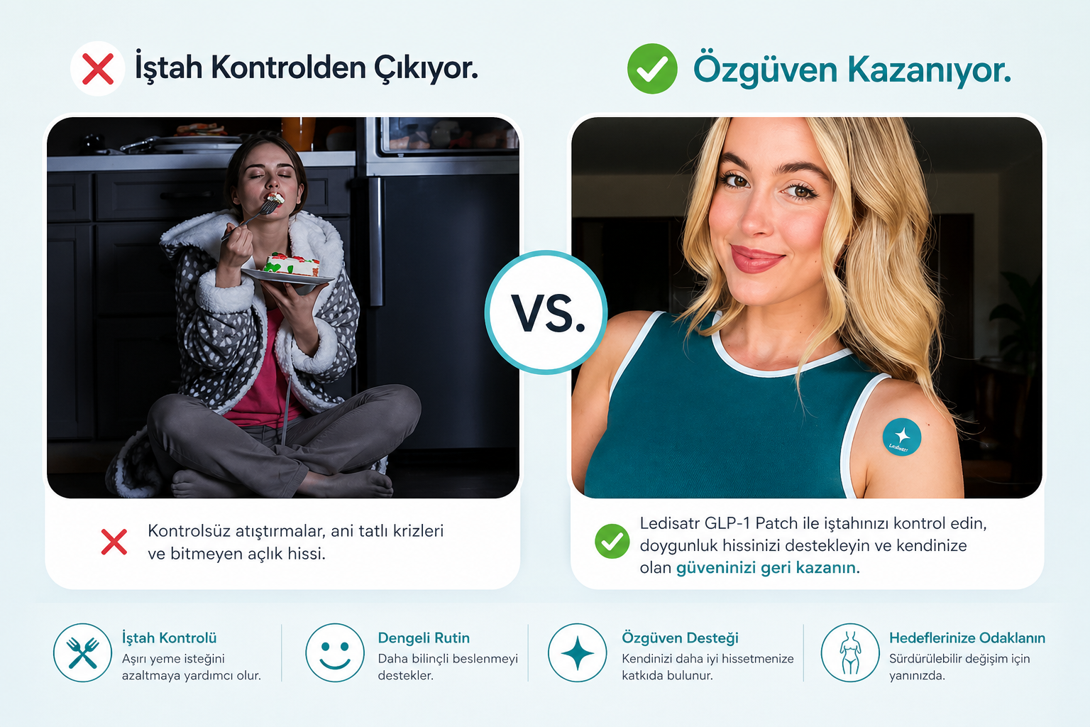LedisaTR GLP-1 Günlük Destek Yamaları, bilim destekli formülüyle iştah kontrolünü doğal yoldan destekleyen bitkisel bileşenli transdermal yamalardır.